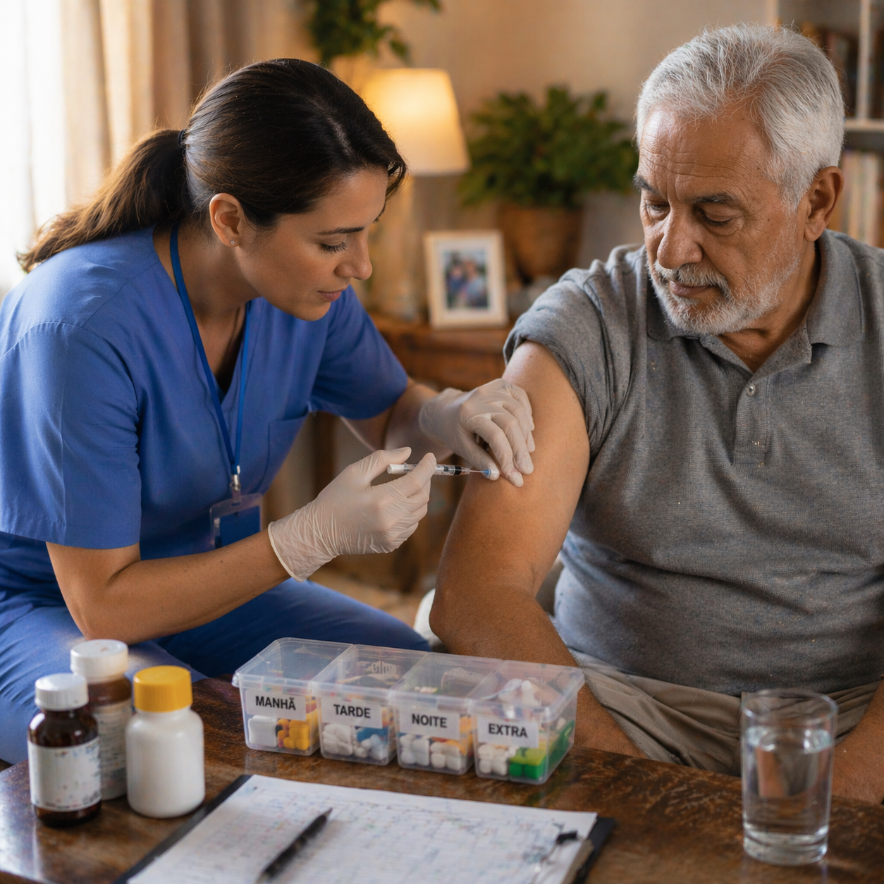 Nossos profissionais seguem uma rotina organizada e segura com controle de horários, doses e registros. Trabalhamos com tabelas de medicação e acompanhamento diário, garantindo que o paciente receba tudo corretamente.